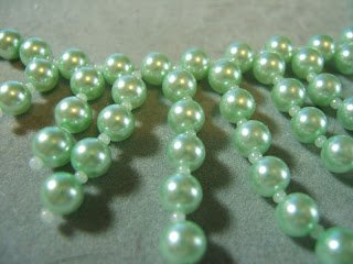 Here is an elegant strand of glass mint-green pearls spaced with white opalescent seed beads. Strands of ascending length grace the center of the necklace, and is closed by a regular spring clasp.